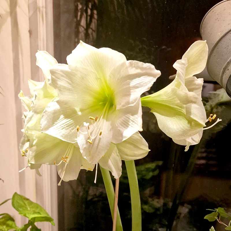 Amaryllis ‘Christmas Gift’ – En sval skönhet. Enkla, gnistrande vita, stora blommor med limegrönt svalg. Kronbladen har en sofistikerad, mjuk volangform.
