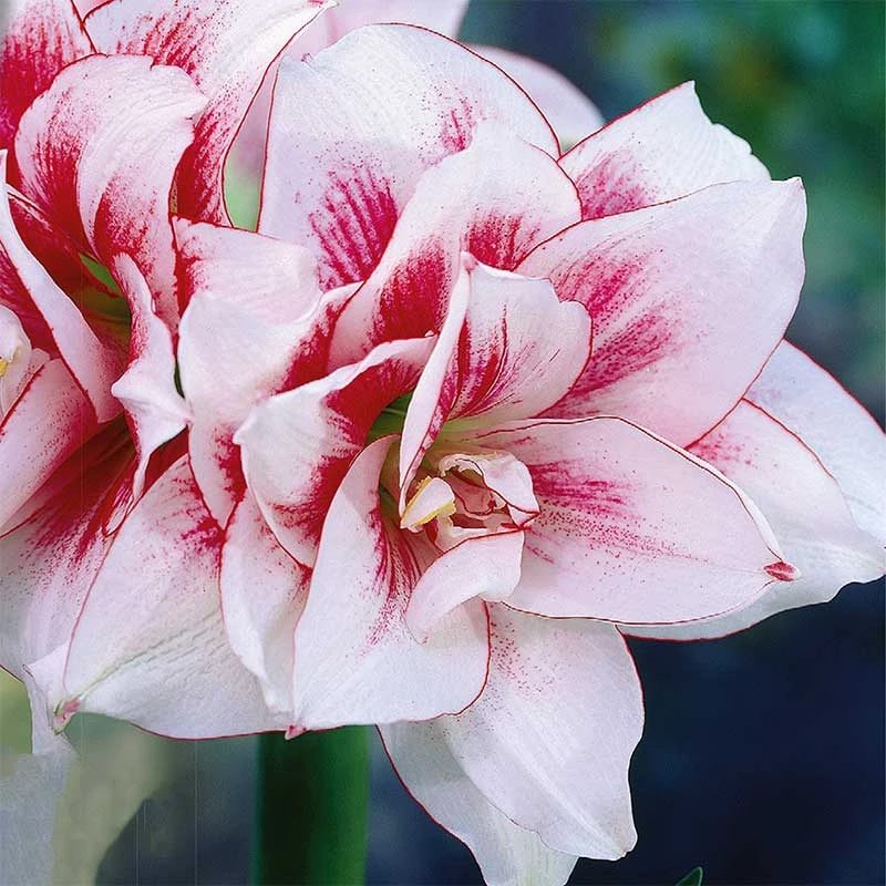 Amaryllis ‘Elvas’ – Underbar, dubbelblommande amaryllis i klara fĂ€ger och ett mörkgrönt bladverk. En enda blomstĂ€ngel ger en stor bukett av ljuva blommor. LĂ„ng blomningtid.