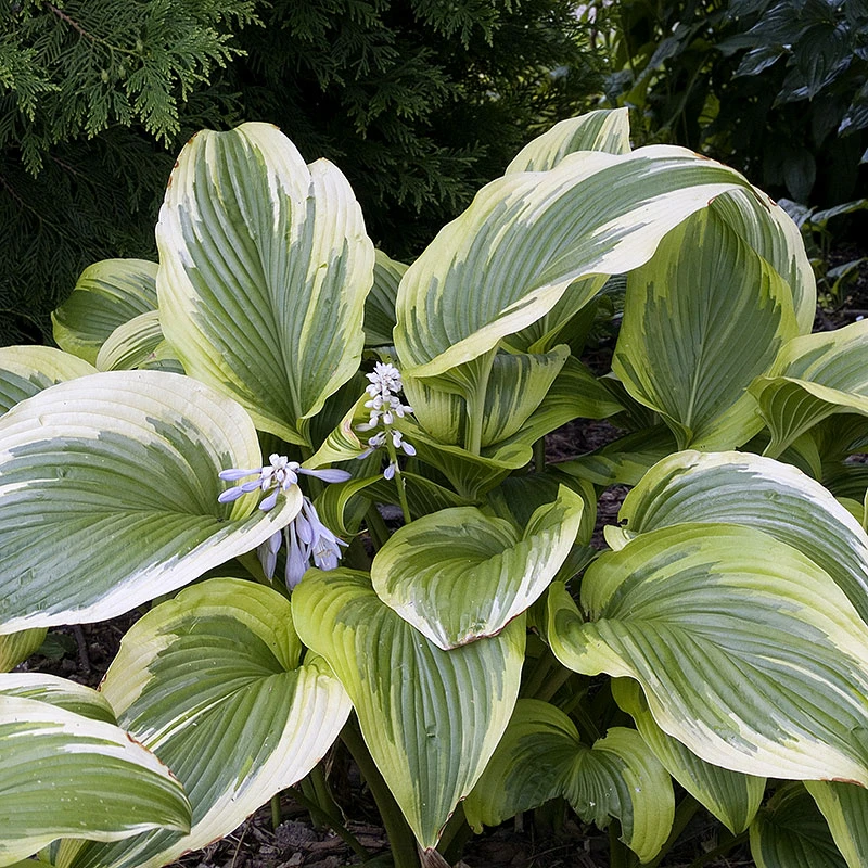 Hosta fortunei ‘Aureomarginata’ fĂ„r breda mellangröna blad med vackert cremegula kanter. Mycket odlingsvĂ€rd. Har vunnit Award of Garden Merit of Royal Horticultural Soceity