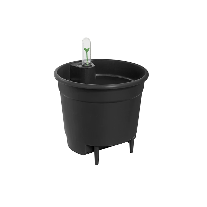Insats till ytterkruka för självbevattning av krukväxter. Insatsen har ett enkelt bevattningssystem som vattnar växterna vid rätt tillfälle med rätt mängd vatten så att växterna kan ta hand om sig själva i flera veckor. Vattenmätaren i systemet visar när det är dags att fylla på med nytt vatten.