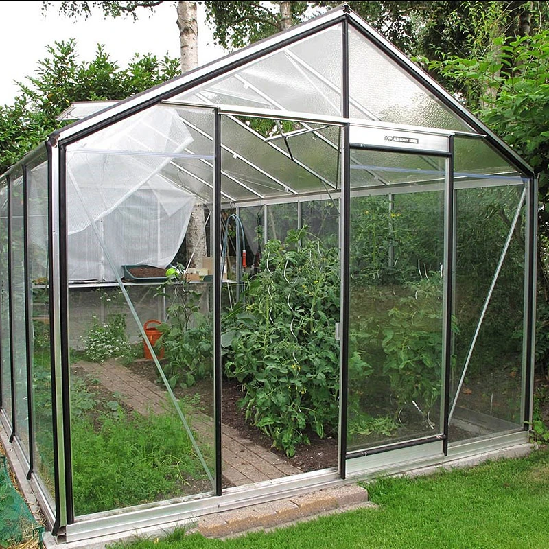 Samtliga modeller har en sjÀlvbÀrande, underhÄllsfri aluminiumram och levereras komplett inklusive nedgjutningsjÀrn för förankring av vÀxthuset. Ingen extra grundram eller extra förstÀrkande takstol behöver köpas till.