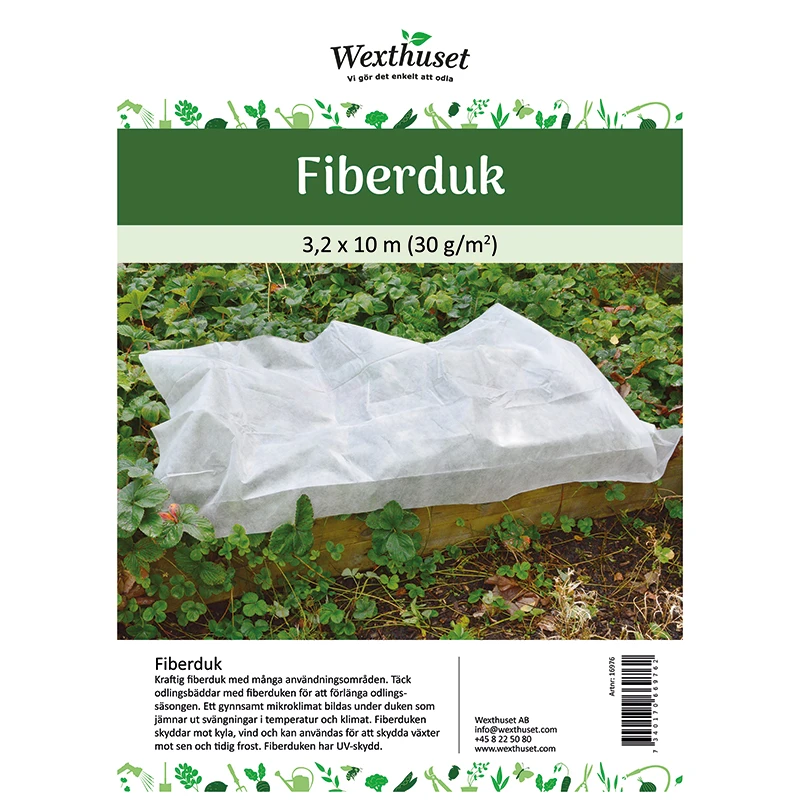 Fiberduken har UV-skydd som gör den mer tÄlig och förlÀnger livslÀngden pÄ duken (duken skyddar inte vÀxterna frÄn UV).