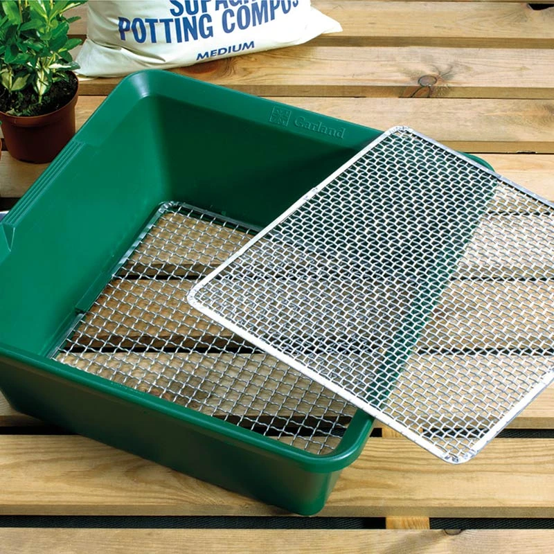 Jättepraktisk, djup jordsåll i kraftig återvunnen polypropylen komplett med två utbytbara såll med 6mm respektive 12mm hålstorlek.