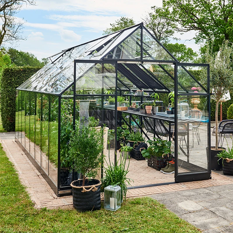 VĂ€xthuset har stabila dubbeldörrar med en glidskena utan hjul vilket gör de lĂ€tta att öppna. Du behöver aldrig kliva över en hög tröskel och kan enkelt rulla in med en skottkĂ€rra eller liknande.Â