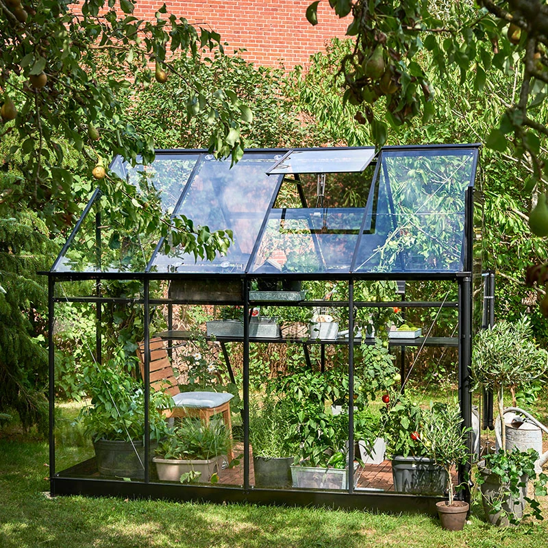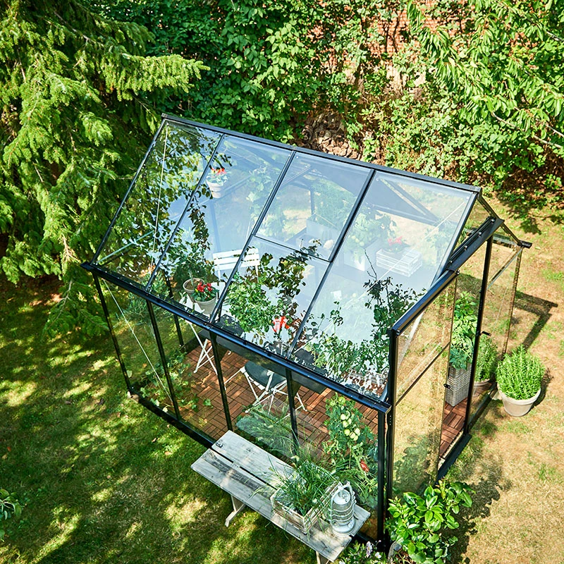 Profilerna Àr slitstarka som garanterar ett robust hus, som ÀndÄ ser elegant ut. Taket Àr högt för att ge kÀnsla av större ytor, luftigare och det Àr konstruerat sÄ att tung snö ska Äka av vÀxthuset snabbt. Stommen Àr gjord utav slitstarkt aluminium som anodiserats för en slÀt och tÄlig yta, Aluminiumet ger en bra stabilitet till vÀxthuset.