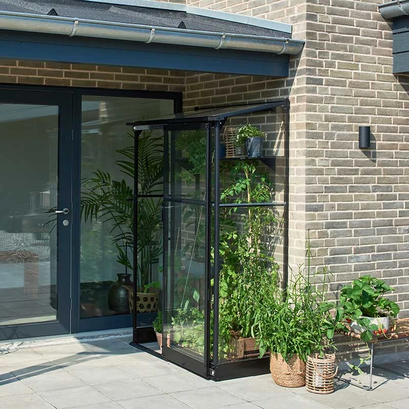 Qube Lean-to vÀggvÀxthus Àr ett stabilt mindre vÀxthus som Àr konstruerat med nyutvecklad stomme för optimal styrka. Stommen garanterar en robust och hÄllbar konstruktion samtidigt som vÀxthuset har ett enkelt och elegant utseende. Glidskenan ger dig en stabil dörr som öppnas lÀtt och nÀr den stÀngs blir den ett med vÀxthuset och bidrar till den eleganta ytan. Skenan Àr utan hjul och konstruerad för att sÀkerstÀlla att dörren inte hakar sig eller hoppar ut.