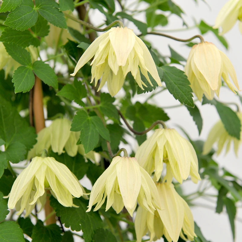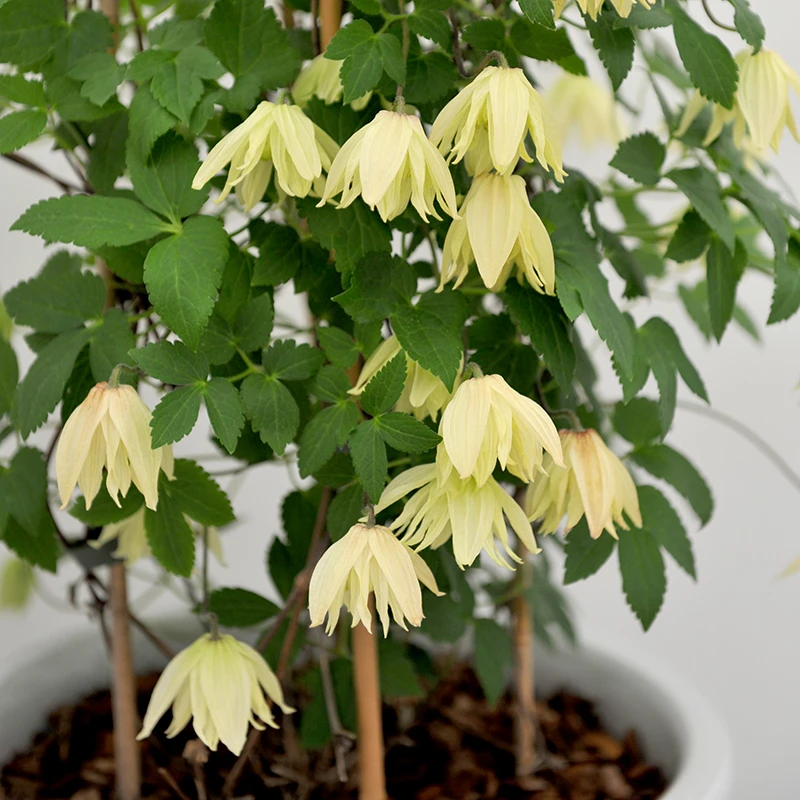 Klematis Amber Àr en remonterande vÀxt som passar utmÀrkt i pergola, spaljé och i urnor. Riklig blomning under maj till juni och med sporadisk blommning under hösten.