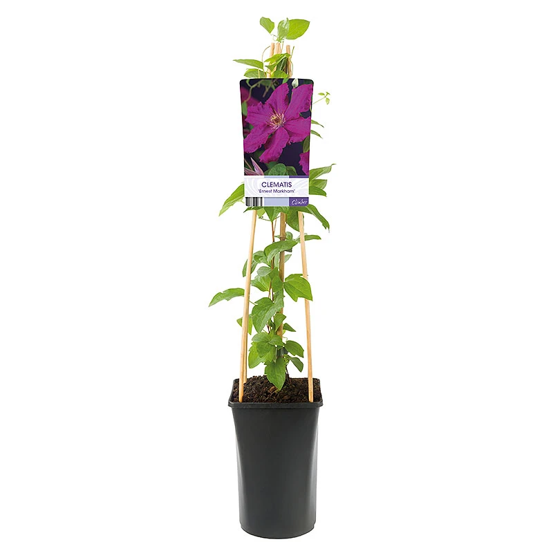 Klematis ‘Ernest Markham’ Ă€r en Ă€ldre storblommig sort. Blommar med stora djupt rödrosa blommor med rundade kronblad frĂ„n juni till september. Passar perfekt att odla i kruka, som elegant terrass vĂ€xt eller att odla mot ljus vĂ€gg, mur eller spaljĂ©.