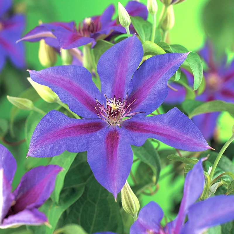 Klematis ‘Mrs N. Thompson’ Ă€r en riktigt stark fĂ€rgkombination. Blommar med blĂ„violeta stora (ca 15 cm) blommor med rödlila stĂ€cka pĂ„ varje blomblad. Blommar frĂ„n maj till augusti.
