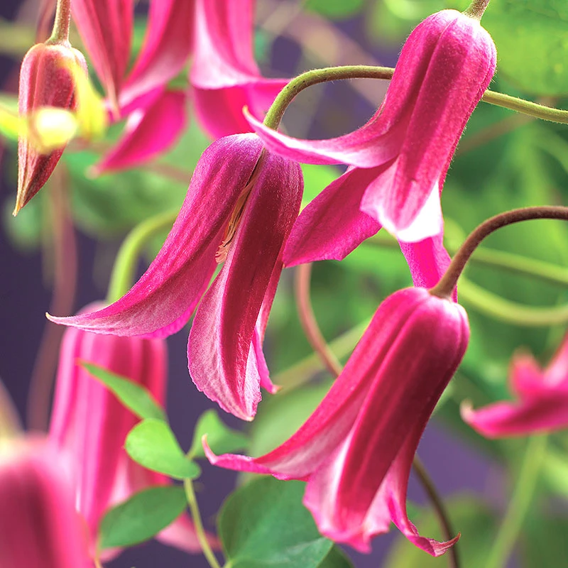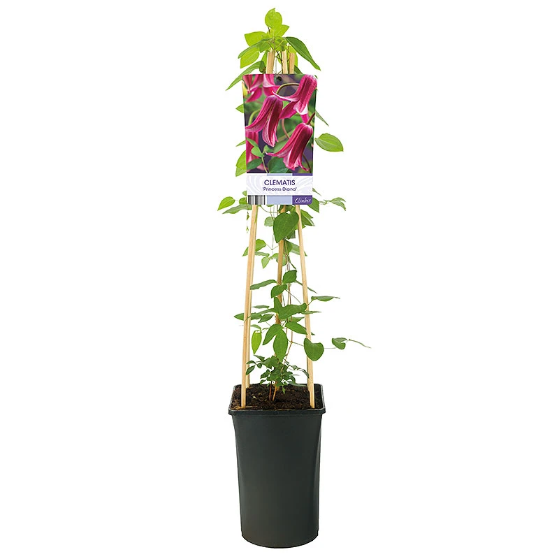 Klematis ‘Princess Diana’ har tulpanformade, rödrosa blommor. Sorten Ă€r kompakt och passar utmĂ€rkt att odla i en kruka. Trivs bĂ€st pĂ„ en varm och skyddad plats.