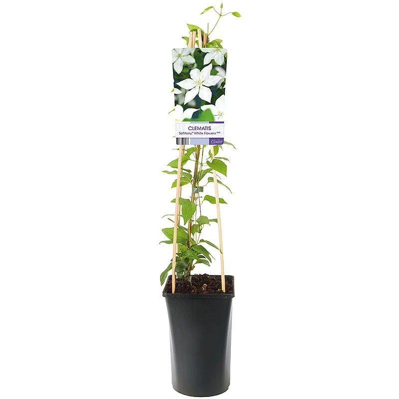 Klematis ‘SoMany® White Flowers’ är en fantastiskt blommande sort som kommer att överraska dig med sina vackra snövita vita blommor under juni-september. Blommor är ca 4-7 cm stora. Fint klematis att ha i en kruka på balkong eller terrass.