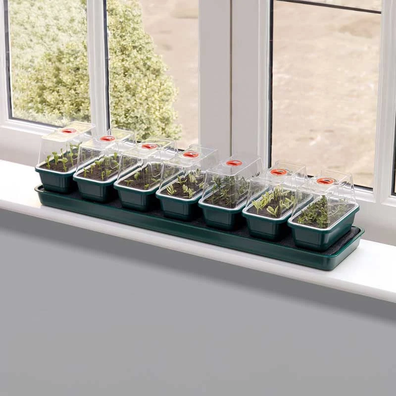 OBS! Som alterantiv till de sju medföljande växthusen passar tre stycken av vårt miniväxthus ‘Small Propagator’ perfekt på plantbrickan.
