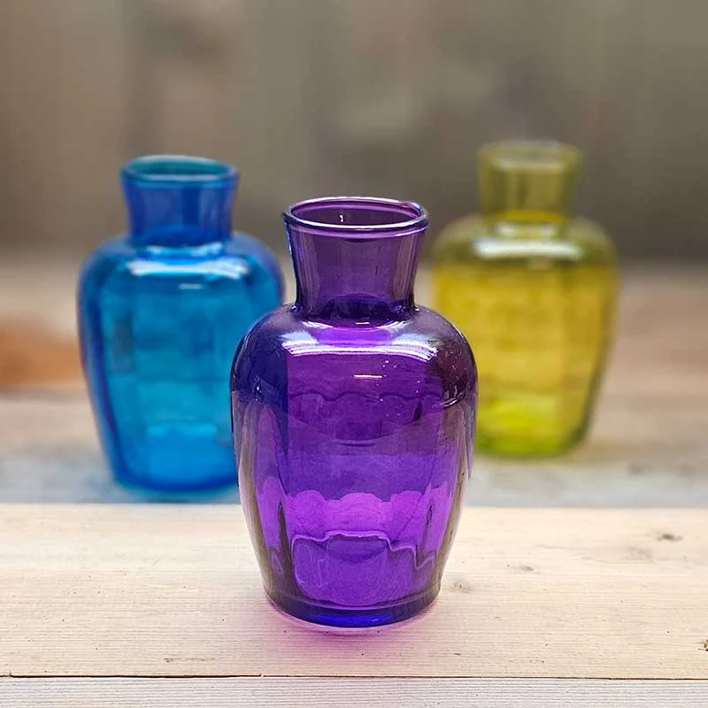 Handgjorda minivaser i Ă„tervunnet glas som doppats i en vacker kulör.Â