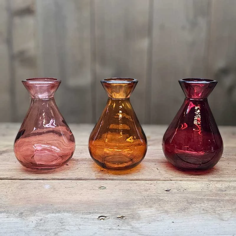 Handgjorda minivaser i Ă„tervunnet glas som doppats i en vacker kulör.Â