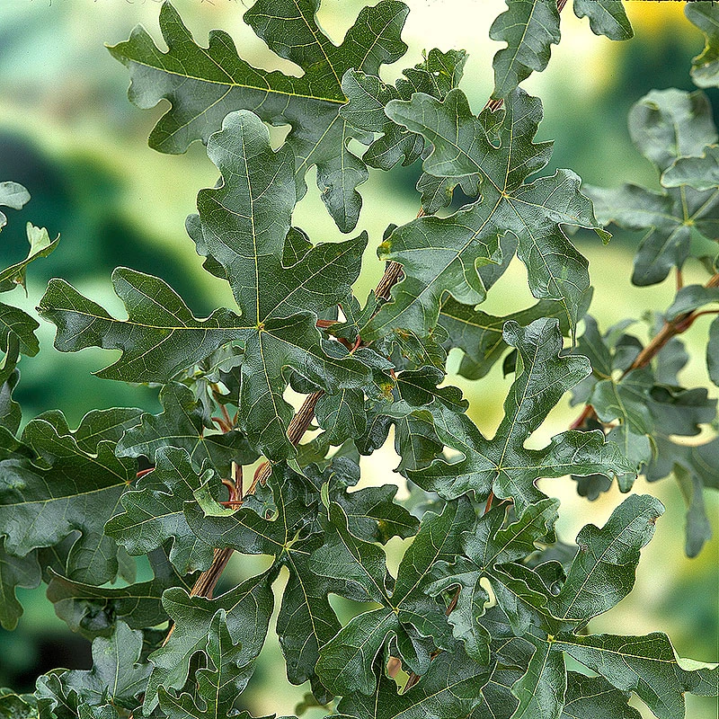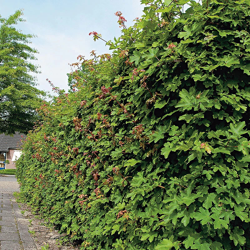 Mycket odlingsvärd häck med ljusgröna trubbiga och flikiga blad.