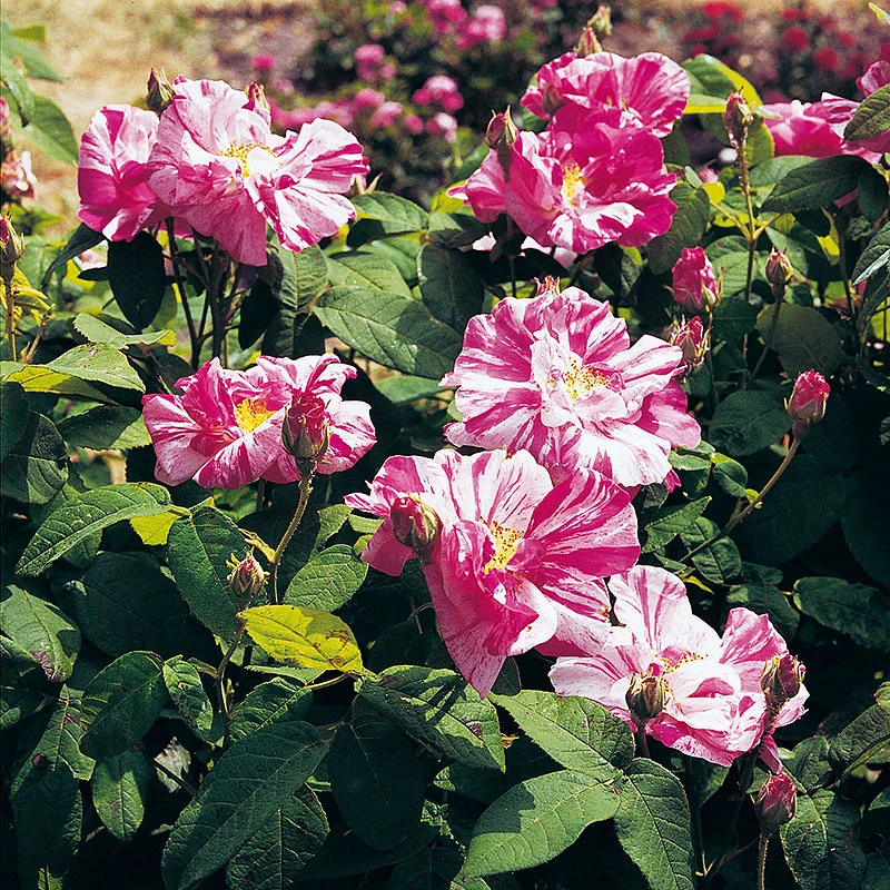 Rosa ‘Mundi’ Ă€r en buskros som kallas polkagris. Blommorna Ă€r karakteristiska strimmiga i vitt, rosa och karminrött, som pĂ„minner polkagris. Blommar rikligt med stora halvfyllda blommor i juni-juli, efter blomning kommer medelstora orangea nypon. Doften Ă€r stark med nyanser av mandel, körvel och mysk. VĂ€xtsĂ€tt Ă€r buskigt, kraftig och sorten blir ca 100-120 cm hög. Bladen Ă€r mörkgröna och glansiga. Plantera som solitĂ€r eller i grupp. Trivs bĂ„de i sol, halvskugga eller skugga, gĂ€rna i vĂ€ldrĂ€nerad, mullrik och nĂ€ringsrik jord. BeskĂ€r pĂ„ vĂ„ren.