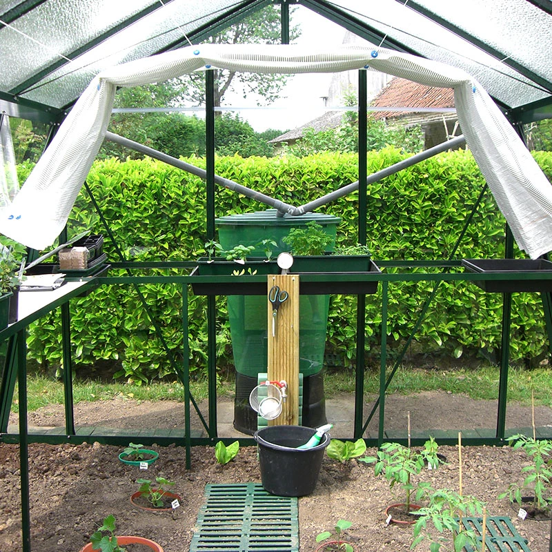 Skuggväven är exakt anpassad till respektive växthusmodell och är komplett med upphängning och fästen som gör det enkelt att fälla ut och dra ihop väven.
