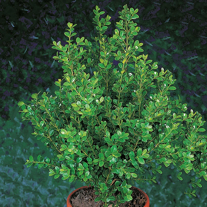 Buxbom ‘Faulkner’ är vintergrön med rundat växtsätt.