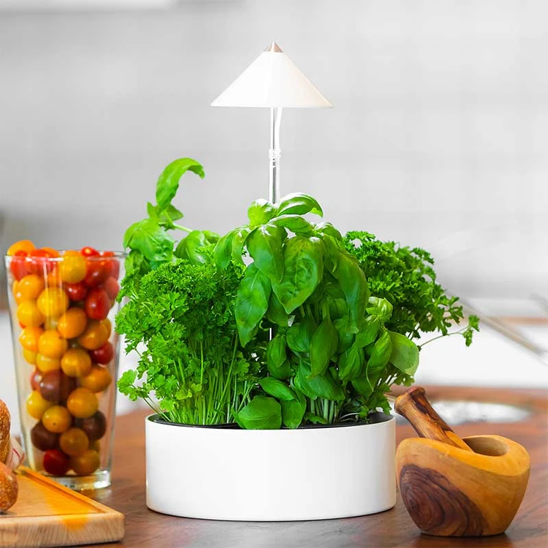 miniHERB Àr ett kit för att enkelt hÄlla liv i dina örter. Smart förvaring som frigör bÀnkyta och hÄller örtvÀxterna vid liv genom att förse dem med effektivt ljus. miniHerb bestÄr av ett speciellt utformat örttrÄg och en SUNLiTE 10W. miniHERB finns i 2 storlekar, miniHerb S (23 cm) och miniHerb L (31 cm).