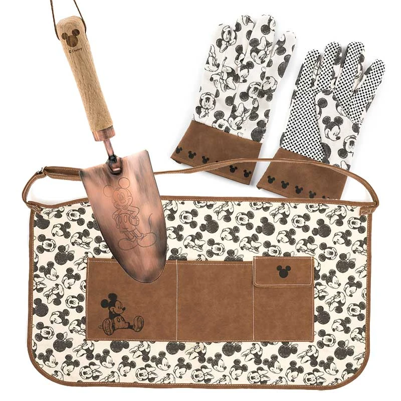 Ett kit med trädgårdshandskar, förkläde och spade med motiv av Musse Pigg.