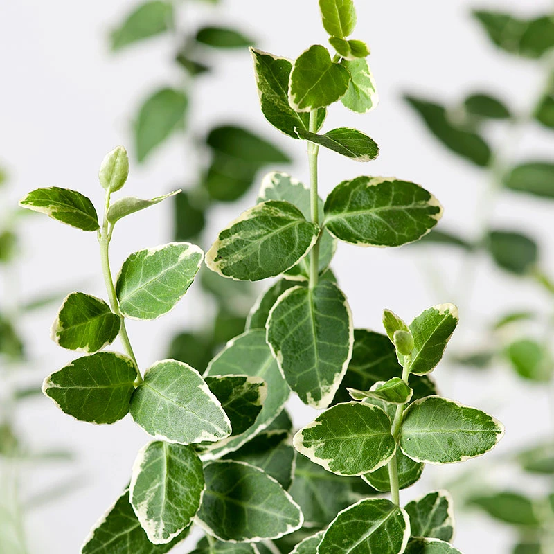 Vitbrokigt städsegrönt bladverk på stam som graciöst breder ut sig. De vitgröna skiftningarna lyser upp i trädgården även på vintern och täcker ytor med sina täta grenar och färgsprakande blad.